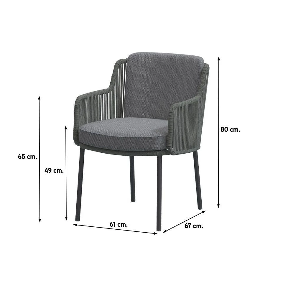 Het frame van de 4 Seasons Bernini tuinstoel is gemaakt van stevig roest vrij staal. RVS heeft een lange levensduur en kan niet verroesten. Voor extra bescherming is het frame afgewerkt met een antracietkleurige coating welke kras- en stootvast is. Om het frame is het kwalitatieve rope bevestigd. Rope is gemaakt van allemaal draden die zijn samengevoegd tot touw. De kern van deze draden bestaan uit kunststof waardoor het geen vocht kan opnemen. Daarnaast is het rope materiaal UV-bestendig en kleurvast. De comfortabele kussens die standaard meegeleverd worden zijn gemaakt van all-weather kwaliteit. Ze kunnen dus gewoon buiten blijven liggen tijdens een regenbuitje. De kussens zijn voorzien van afritsbare hoezen die gewassen kunnen worden op 30 graden. Ideaal wanneer ze vies zijn geworden.