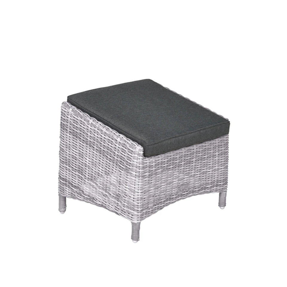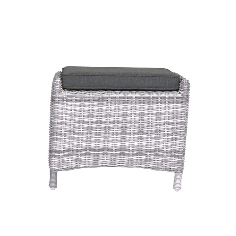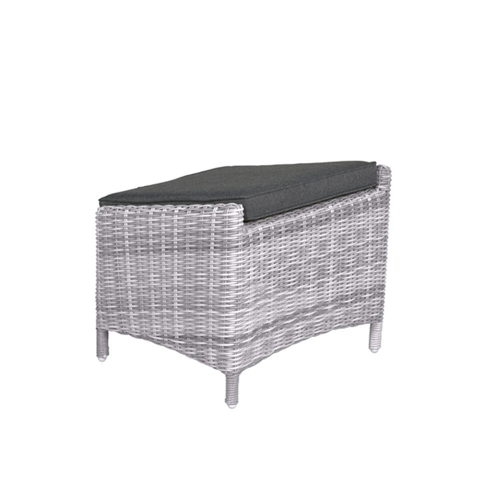 Ben je op zoek naar een voetenbank voor bij de Collin tuinstoel? De Collin voetenbank is een praktische voetenbank die veel wordt gecombineerd bij de Collin tuinstoel van kwaliteitsmerk Garden Impressions. De voetenbank wordt geleverd inclusief een comfortabel kussen. De voetenbank is voorzien van een aluminium binnen frame met daaromheen hand gevlochten 5 mm half rond kunststof wicker draad. Het kussen is gemaakt van hoogwaardige kwaliteit polyester. Het kussen is voorzien van een rits, waardoor de hoes gemakkelijk met de hand gewassen kan worden. Het kussen van de Collin voetenbank is niet waterbestendig en dient na gebruik opgeborgen te worden. Deze fijne voetenbank wordt volledig gemonteerd geleverd, het genieten kan direct beginnen. De afmeting van de voetenbank is : B 53 x D 53 x H 40,5 cm. Gemaakt van wicker in de kleur cloudy grey met een aluminium binnen frame en een polyester kussen in de kleur reflex black.