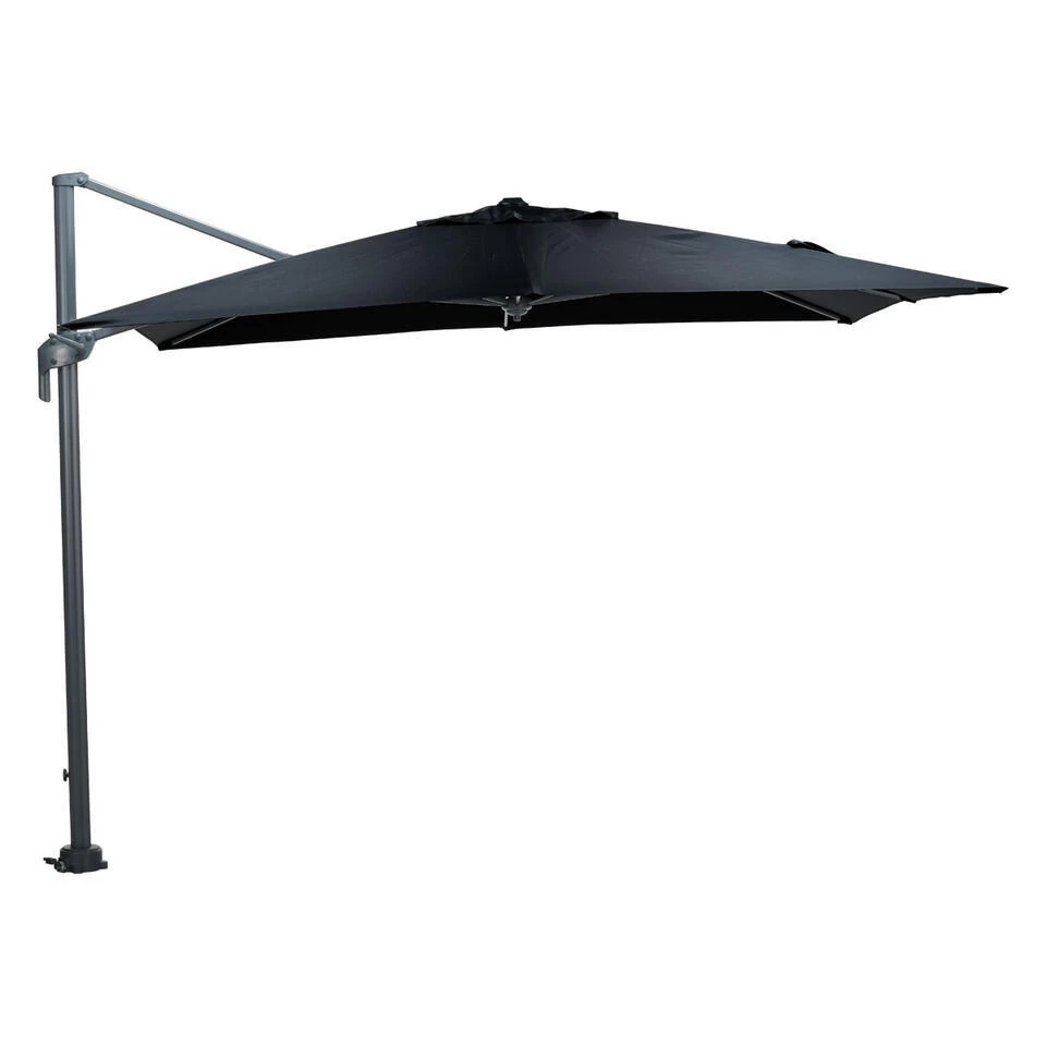 De zweefparasol is verticaal te kantelen en 360 graden rond te draaien. Ideaal om met de zon mee te bewegen zonder de hele parasol te moeten verplaatsen. Bij deze zweefparasol moet minimaal een 80 kg hawaii parasolvoet. De zweefparasol is licht van gewicht en kan makkelijk opgeborgen worden in de schuur wanneer er slecht weer aan komt. Doe je de parasol ’s avonds dicht dan kun je er een hoes over heen doen, die los aangeschaft kan worden. Het parasoldoek heeft een zwarte kleur.