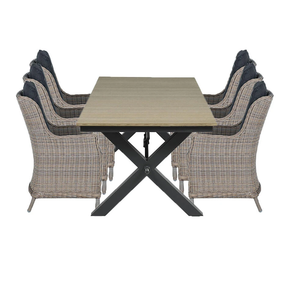 De tuinstoel heeft een afmeting van 62 bij 73 en is 96,5 cm hoog. De tuintafel is 240 bij 100 cm en is 76 cm hoog. De tuinset bestaat uit zes stoelen en 1 tuintafel.