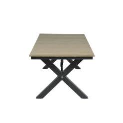 Het tafelblad van de Fiesta is gemaakt van teak hout. Teakhout heeft als eigenschap langzaam te groeien, hierdoor zitten de houtvezels dicht op elkaar wat maakt dat het hout altijd glad blijft aanvoelen. Teak is een vettige houtsoort waardoor deze bartafel uitermate geschikt is voor buiten. Het eigenschap van teakhout is dat het hout na verloop van tijd zal verkleuren. Tevens kan het voorkomen dat er haarscheurtjes en kleine bartjes komen in het hout. De teak houten tafel wordt onbehandeld bij u geleverd.Â
