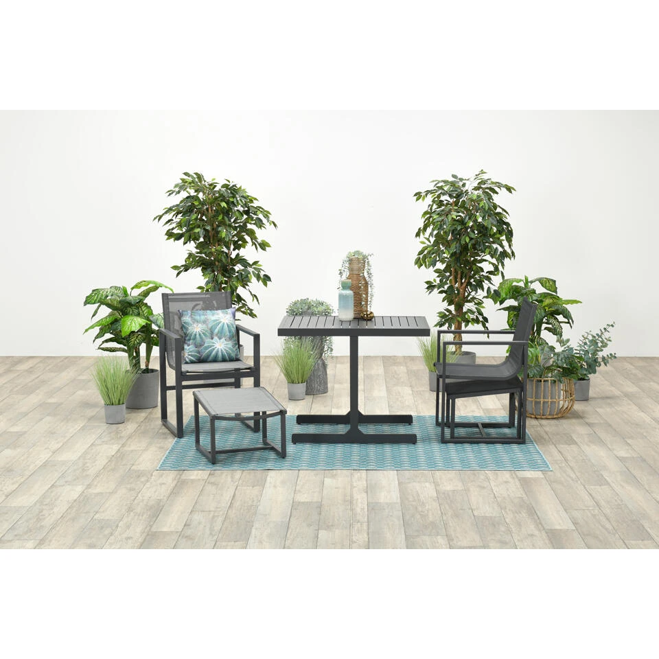 Heb jij een balkon en zoek je nog een leuke balkonset? Bekijk dan eens de Nava balkonset van kwaliteitsmerk Garden Impressions. Deze set is gemaakt van aluminium, waardoor de set licht van gewicht is. De zitting en de voetenbank zijn ook deels vervaardigd uit texitleen. Wat de set een comfortabele zit geeft. De Nava tuinstoel is vervaardigd uit een aluminium frame. Dit aluminium frame is voorzien van een sterke poeder coating laag. De beschermlaag zorgt er voor dat de stoel kras- en stootvast is. Voor de zitting en de rugleuning van deze stoel is gebruik gemaakt van een textileen all-weather doek. De Nava balkonset wordt geleverd met twee aluminium textilene voetenbanken, wat extra comfort geeft aan de balkonset. Het frame van de voetenbank is van donker grijs aluminium en het voetenvlak is vervaardigd uit all weather textileen. De Nava tuintafel is vervaardigd uit een onderhoudsvrij aluminium frame met een matte poedercoating. Het tafelblad is ook gemaakt van aluminium met een donkere poedercoating. De tuintafel is gemakkelijk schoon te maken met een sopje van groene zeep.