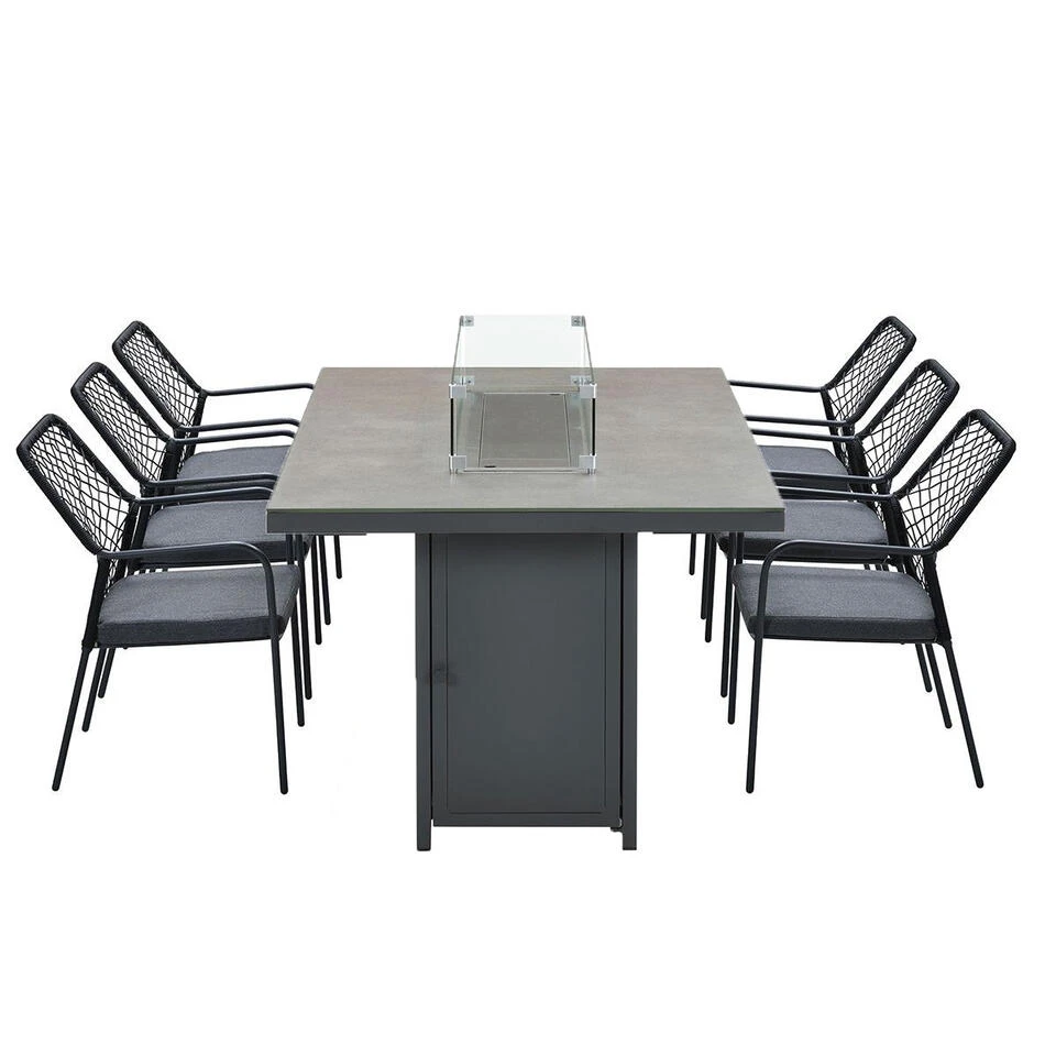 De Cozy Living Elnes tuintafel met vuurhaard is gemaakt van een onderhoudsvrije RVS brander en slate ceramic glass blad. De RVS-brander wordt mooi weggewerkt door de meegeleverde witte stenen. Heb je kinderen en vind je de vlammen toch wat gevaarlijk? Dit is gemakkelijk op te lossen met een glazen langwerpige ombouw. Deze wordt standaard meegeleverd. Bij deze gas vuurtafel wordt standaard een afdekhoes meegeleverd voor het vuur gedeelte van de tafel.